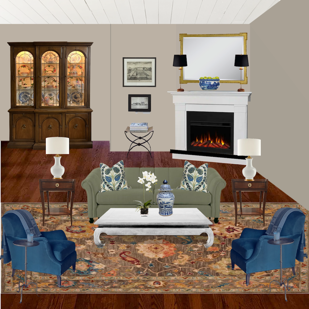 I began with Cher’s rug and a similar sage sofa with beige walls and the corner fireplace. I’m not too fond of the wall color with the rug and sofa.