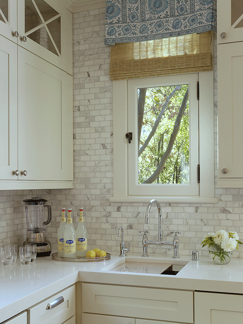 Above is another kitchen I’ve long admired with Carrara marble tiles in a smaller brick pattern from Ann Sacks.