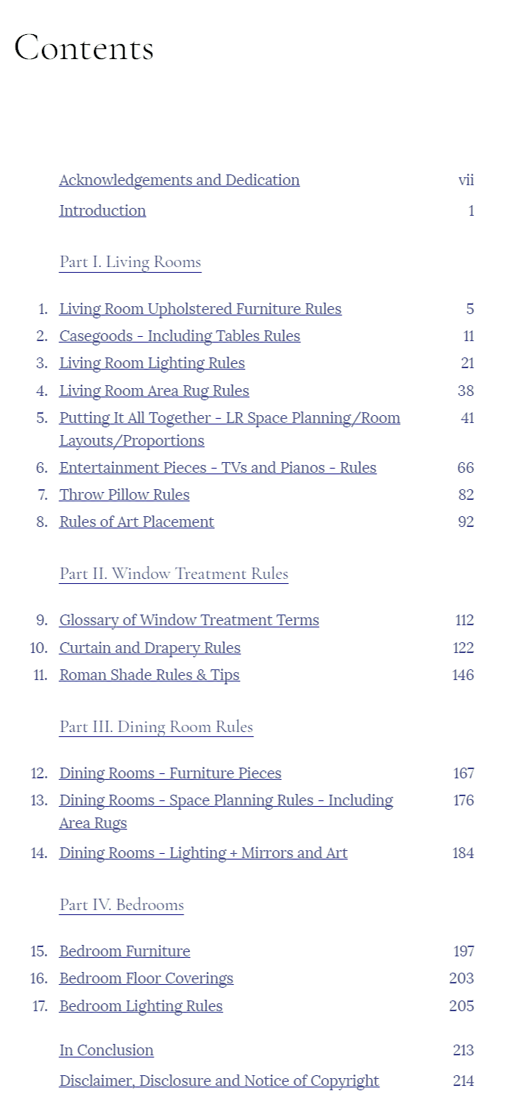Also included are rules and tips for floor coverings, furniture pieces, art. Oh wait, here’s the Table of Contents.