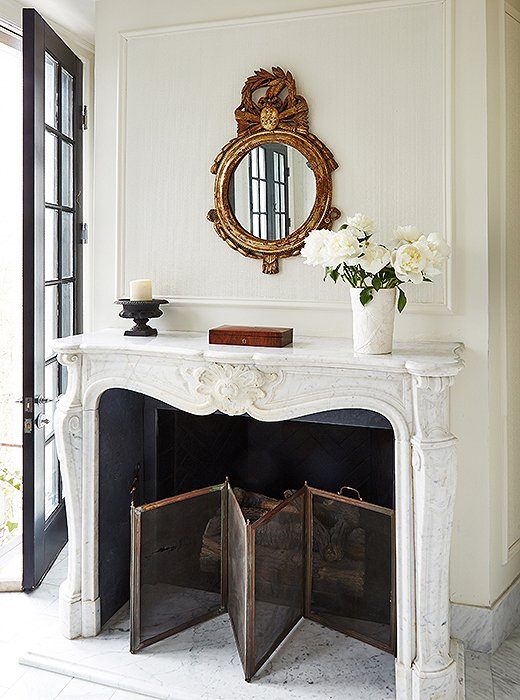 Who would think to add an 18th-century gilt Federal mirror in a bathroom? Is that a real working fireplace? I don’t know, but how cool would that be?