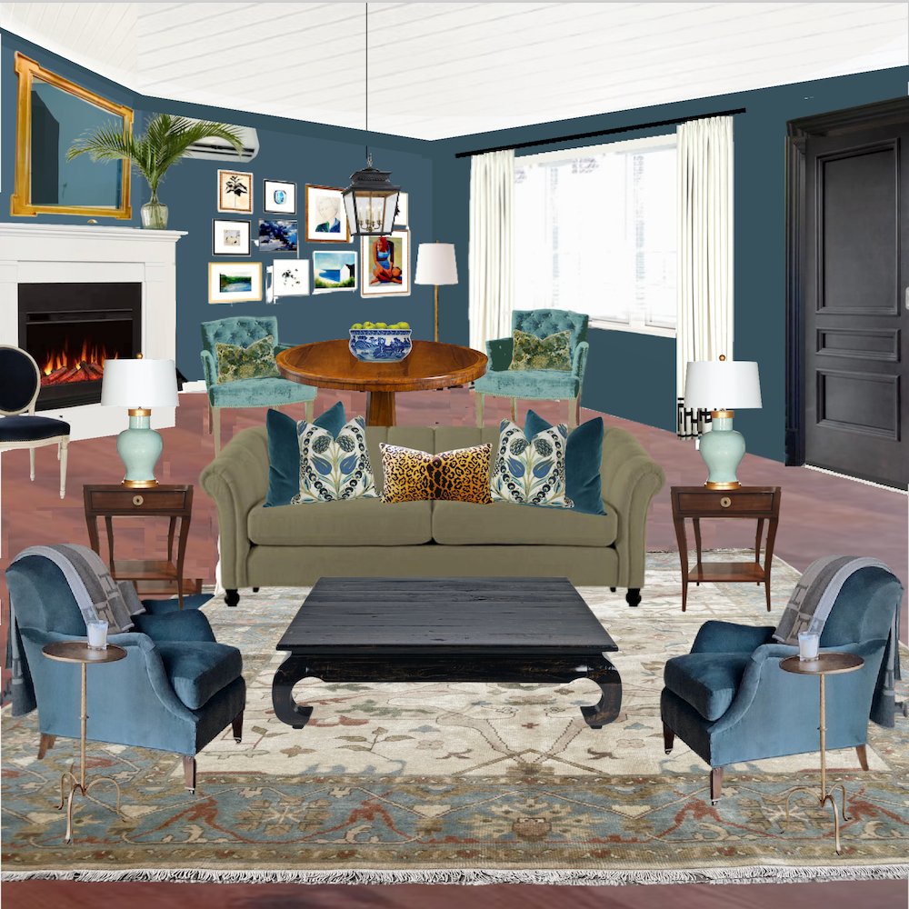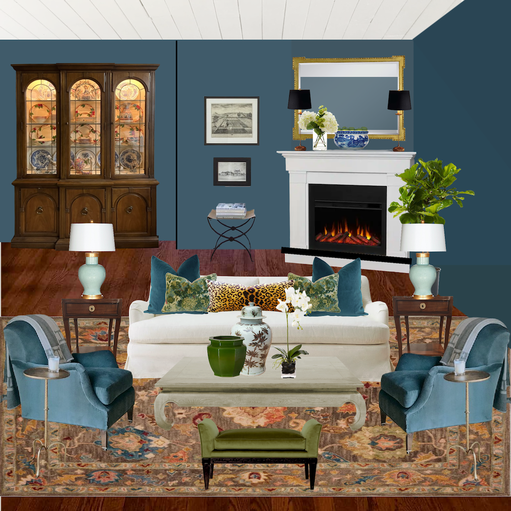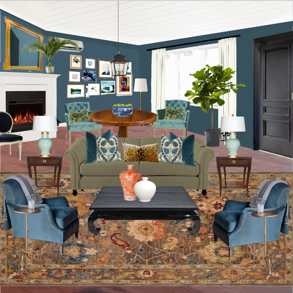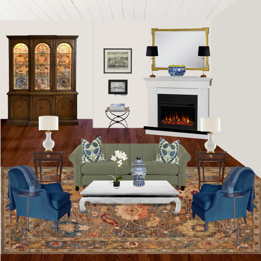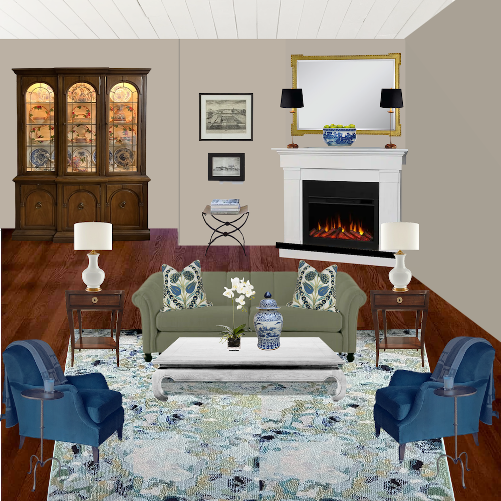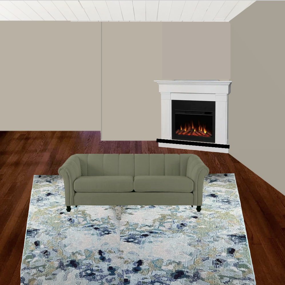 I began with Cher’s rug and a similar sage sofa with beige walls and the corner fireplace. I’m not too fond of the wall color with the rug and sofa.