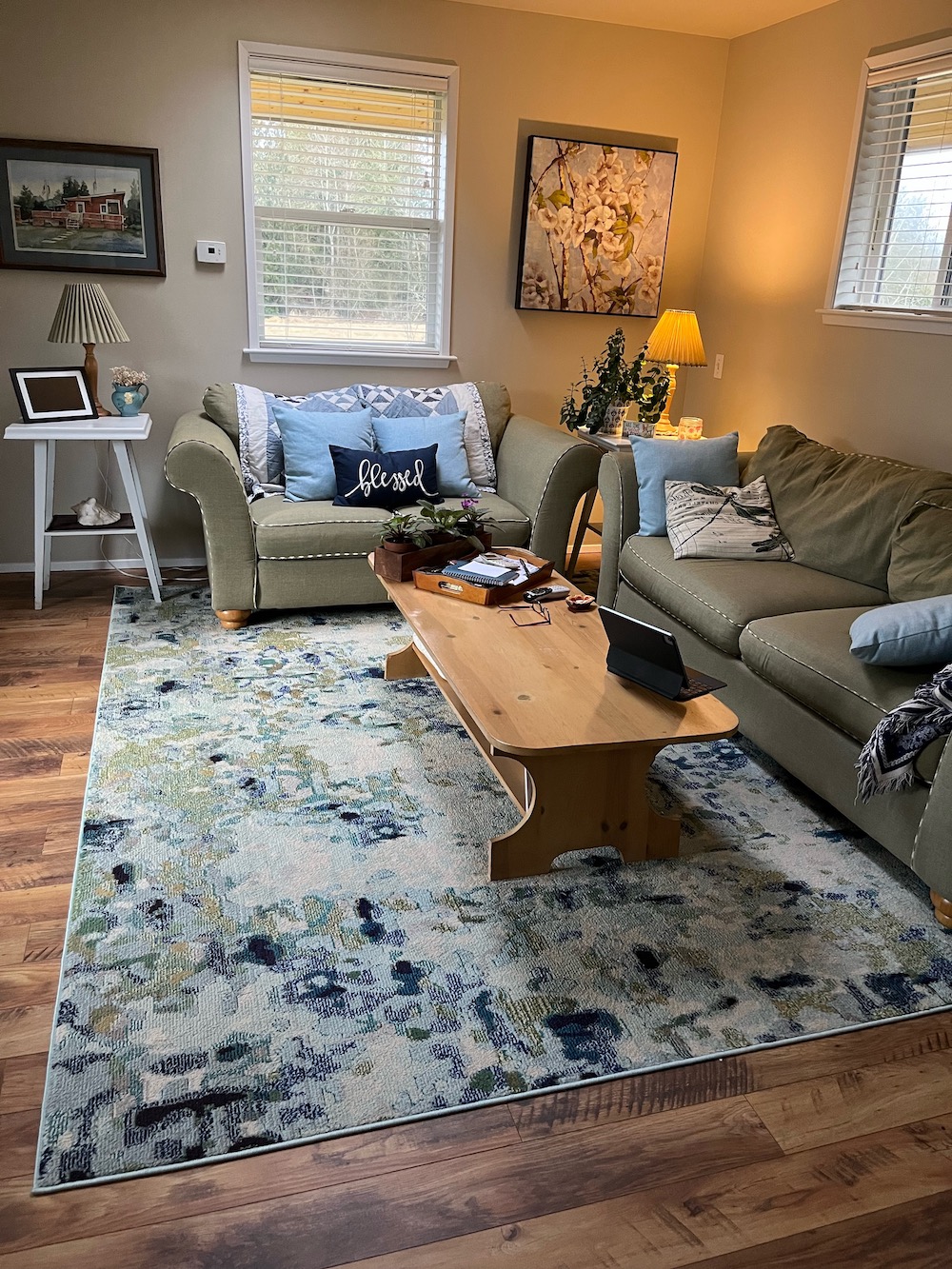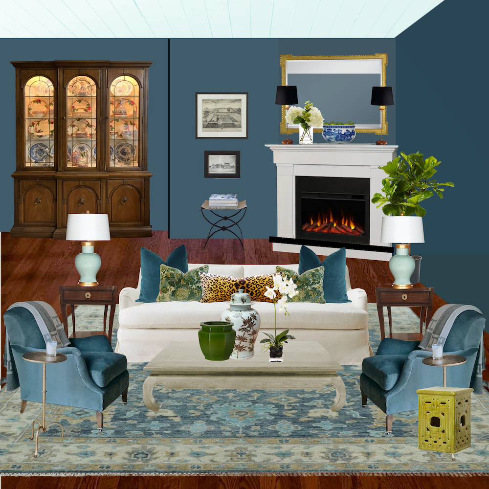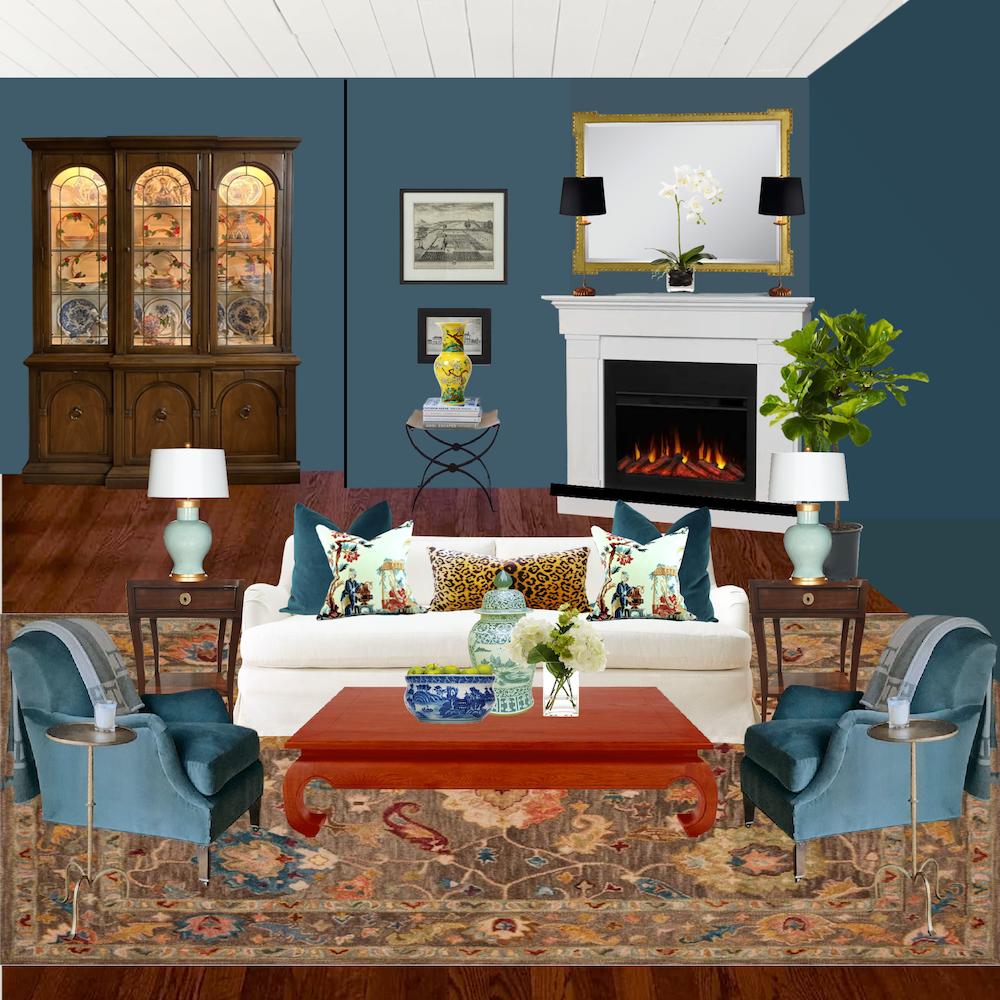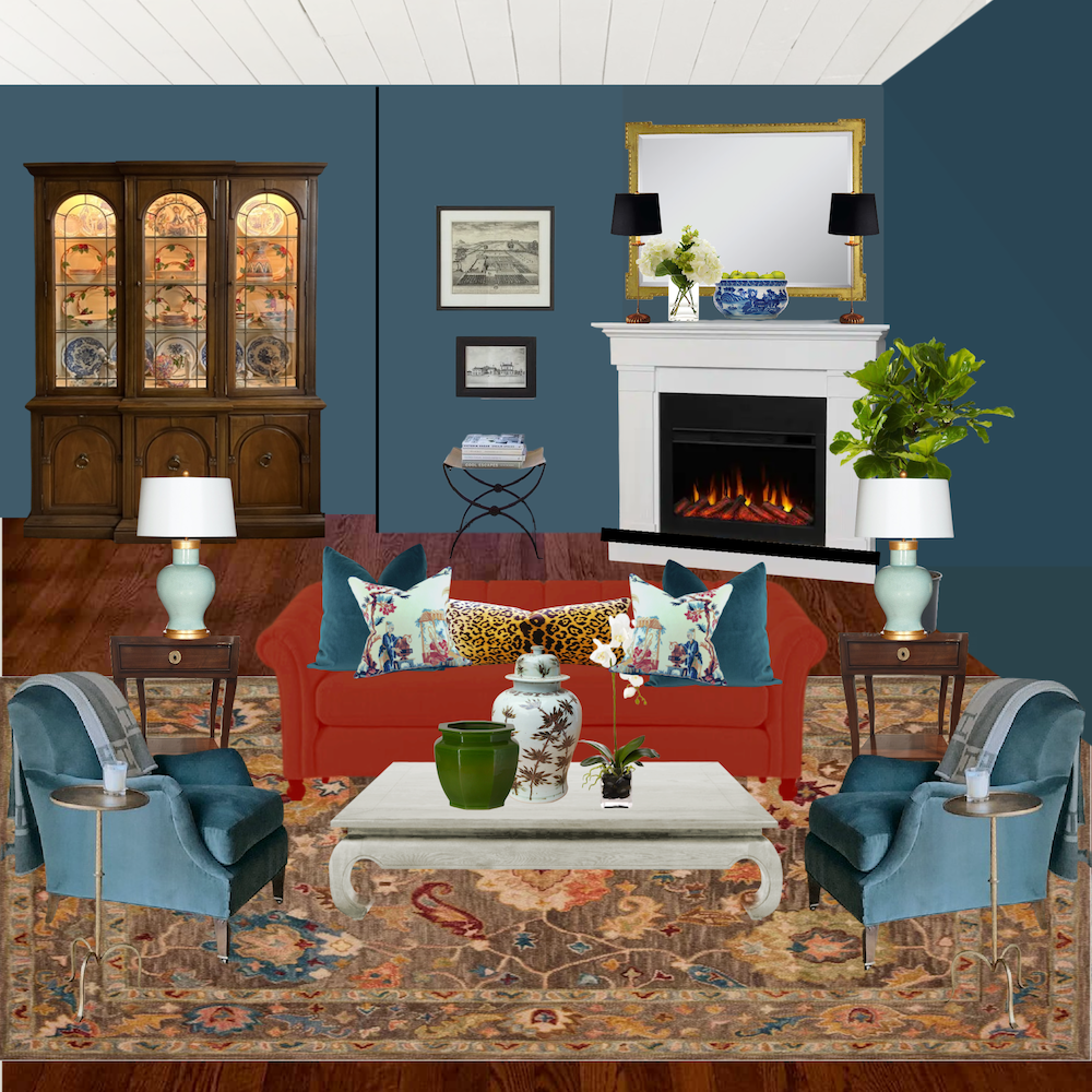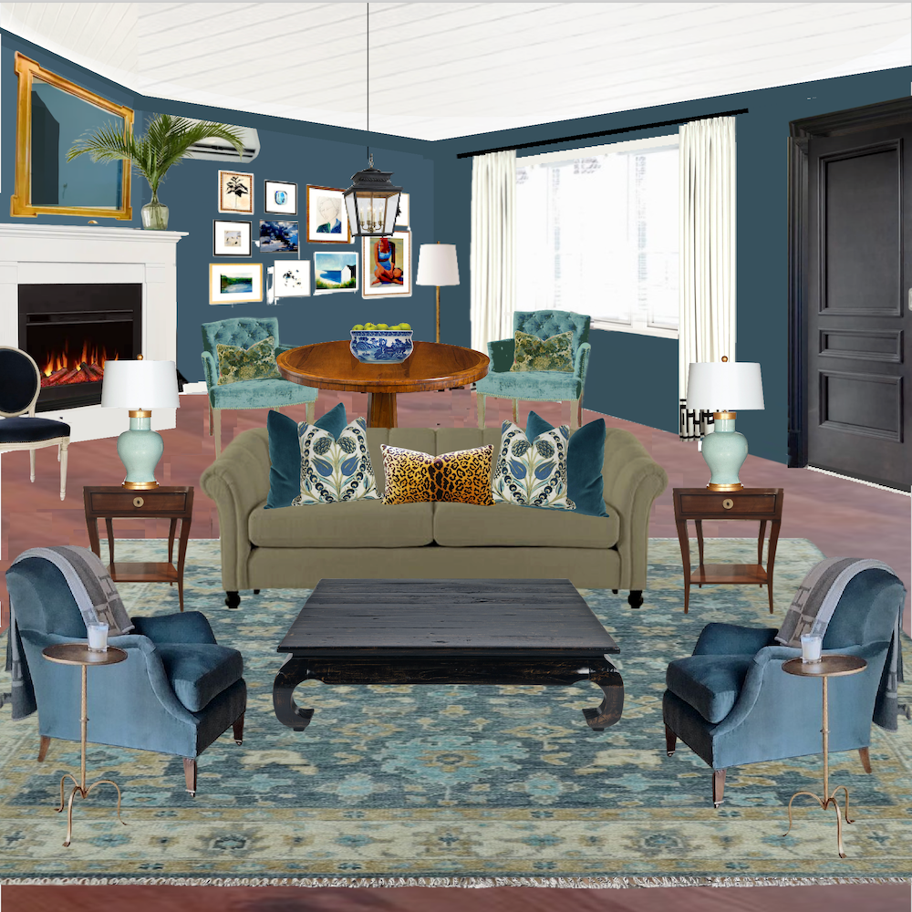 I began with Cher’s rug and a similar sage sofa with beige walls and the corner fireplace. I’m not too fond of the wall color with the rug and sofa.
