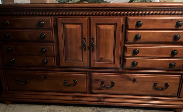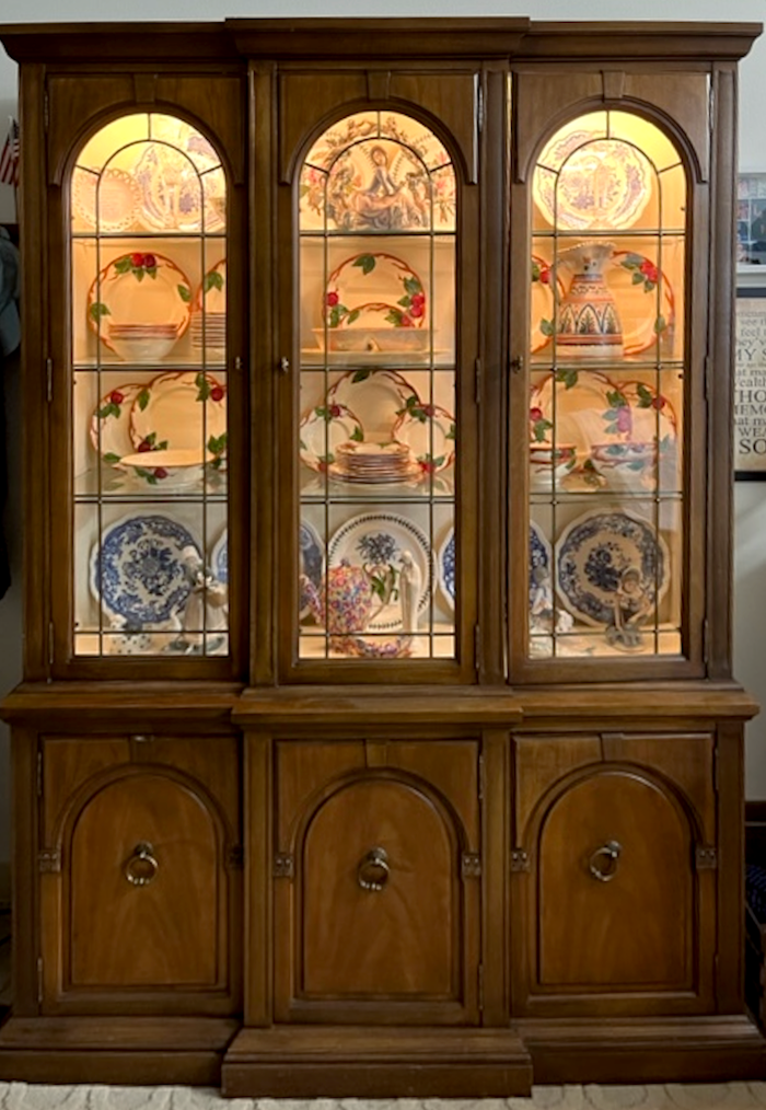 Cher is also bringing over two brown pieces of furniture. Above is an heirloom breakfront. It might be cherry or pecan.