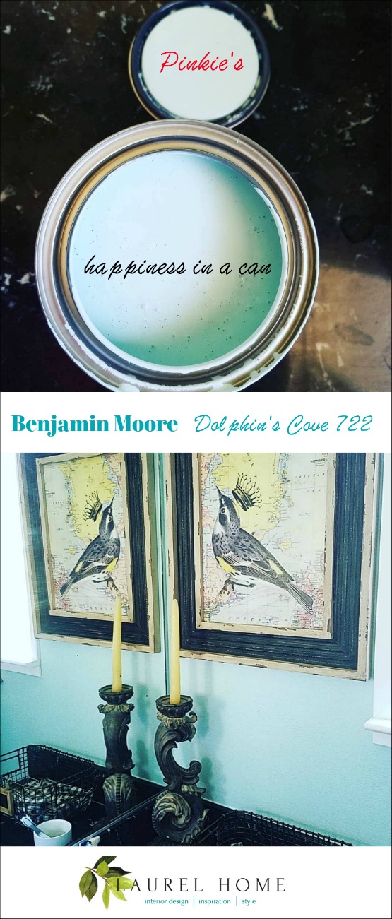 Oh, that reminds me. One of the sweetest readers, a woman named Pinkie, who always comments on my posts on Facebook, posted a little vignette using Dolphin’s Cove. One of the Laurel Home 144 paint colors.