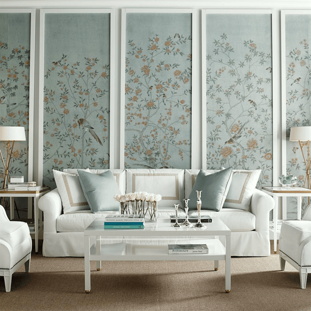More furniture by Suzanne Kasler for Hickory Chair. The fabulous Chinoiserie wallpaper panels are by De Gournay.